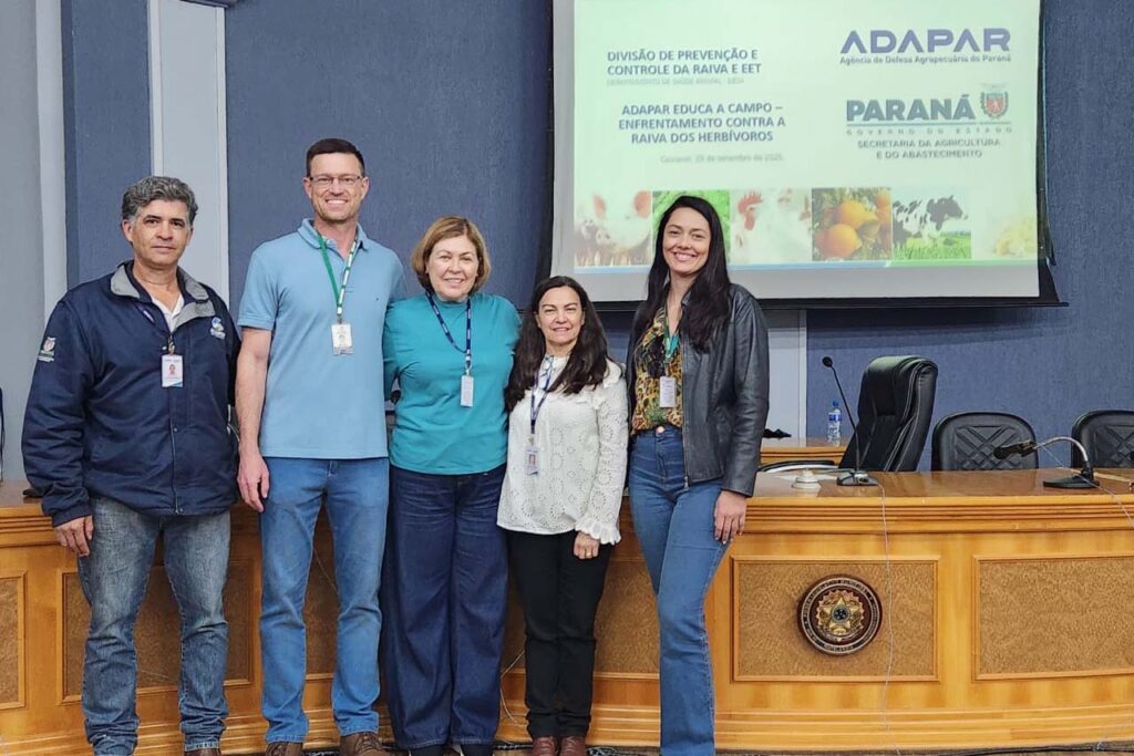 Outra ação ocorreu na Cooperativa Agroindustrial de Cascavel (Coopavel), onde responsáveis técnicos da cooperativa participaram de uma apresentação conduzida por médicos veterinários da Adapar. No encontro, os profissionais detalharam aspectos sobre a raiva dos herbívoros, reforçando a importância da prevenção e do cumprimento das medidas de biosseguridade para reduzir os riscos da doença na região.