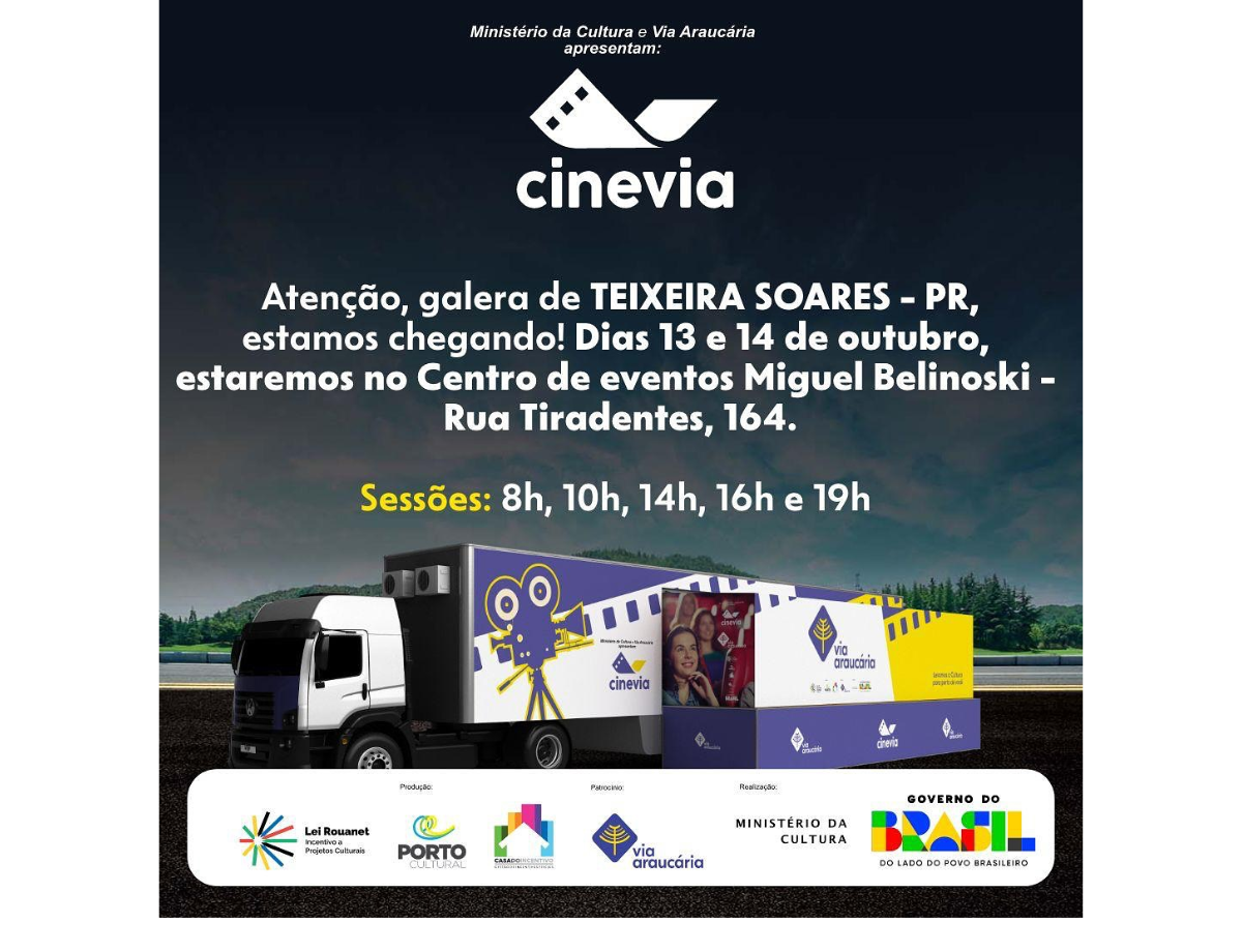 O município de Teixeira Soares será palco de uma experiência cultural especial nos dias 13 e 14 de outubro com a chegada do Cinevia, projeto que percorre o Paraná levando sessões de cinema gratuitas para diferentes cidades. As exibições acontecerão no Centro de Eventos Miguel Belinoski (Rua Tiradentes, 164), em cinco horários ao longo do dia: 8h, 10h, 14h, 16h e 19h. A iniciativa busca democratizar o acesso ao cinema, proporcionando lazer e cultura para todas as idades.