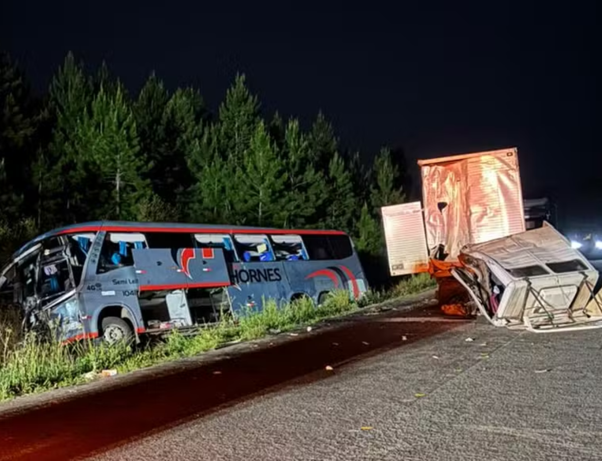 Duas pessoas morreram e outras 23 ficaram feridas em um acidente entre um ônibus fretado por uma família e um caminhão na noite de domingo (5) na PR-151, entre São Mateus do Sul (PR) e Três Barras (SC). O acidente ocorreu por volta das 21h20, no km 468 da PR-151, na região de São Miguel da Roseira. A pista ficou totalmente interditada em ambos os sentidos até às 2h da madrugada desta segunda-feira (6), quando o trânsito foi liberado.