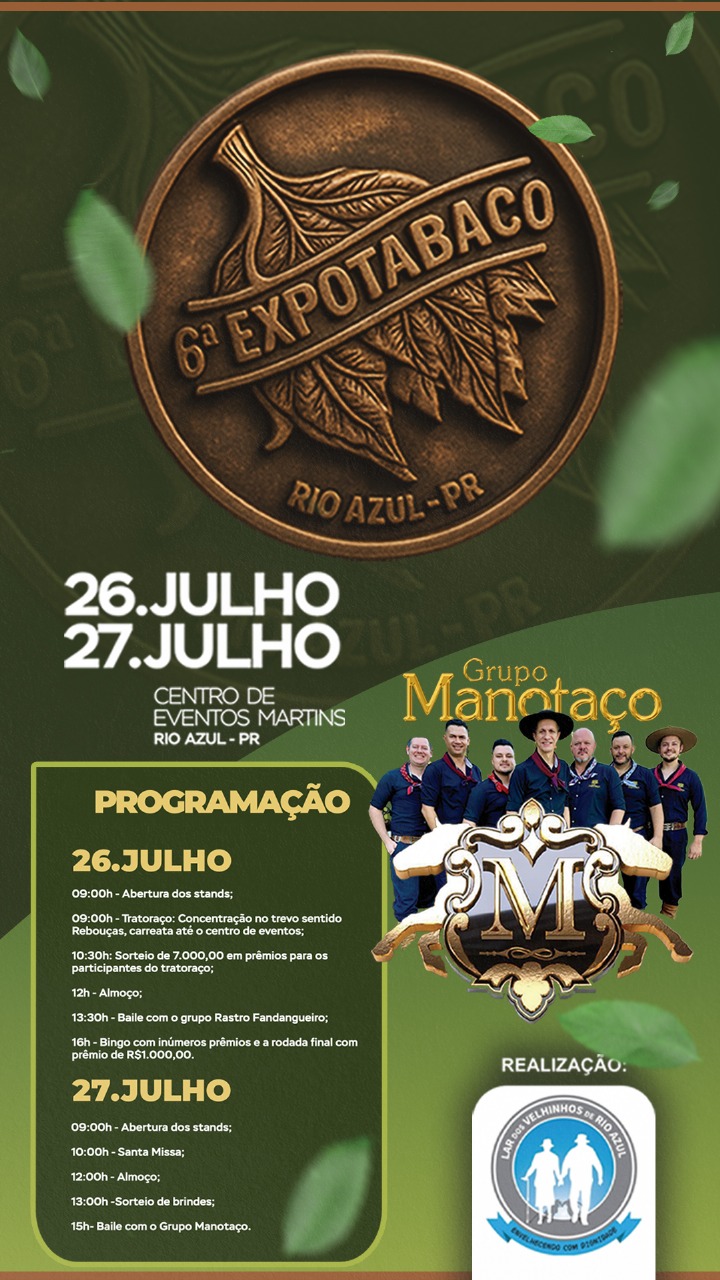 A ExpoTabaco é organizada pela diretoria do Lar dos Velhinhos de Rio Azul e contará com estandes de empresas do setor agropecuário, como a Coelho Equipamentos Agrícolas e a Excelência Solar, que apresentarão soluções em maquinário e energia solar voltadas ao campo.