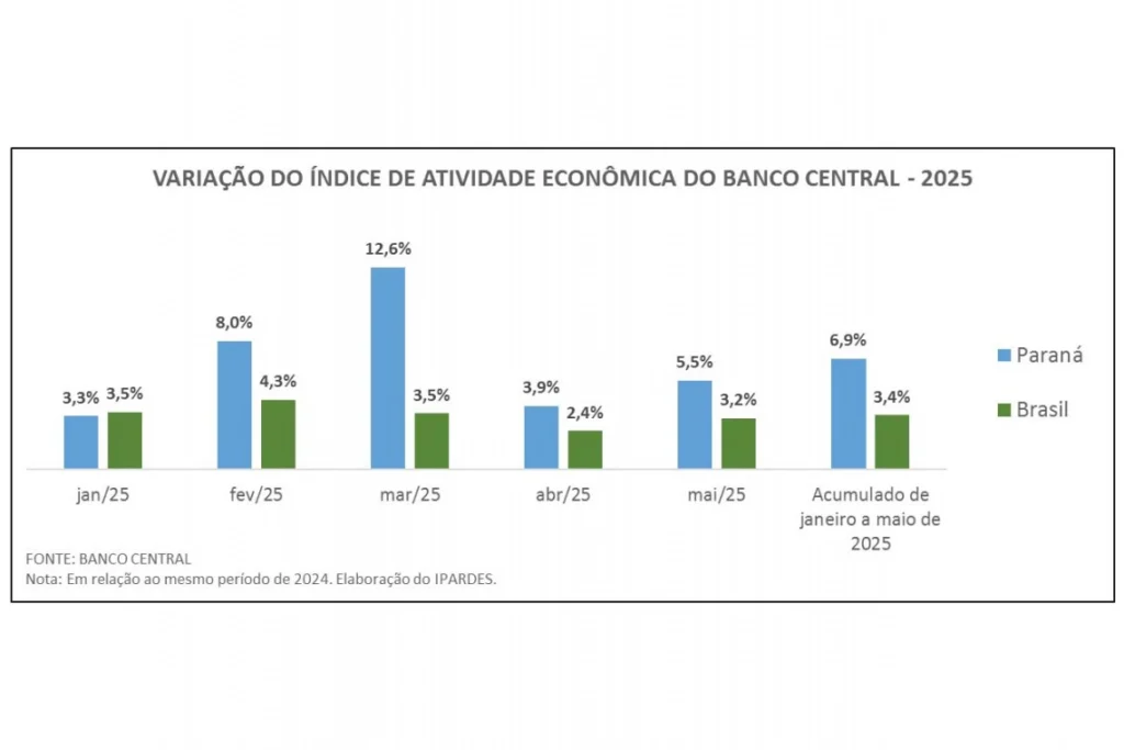 O Paraná registrou o maior crescimento da atividade econômica do Brasil nos primeiros cinco meses de 2025, com 6,9%, segundo dados do Banco Central. É o dobro do mesmo resultado nacional no período, que foi de 3,4% (diferença de 3,5 pontos percentuais). O comparativo é com o mesmo período do ano anterior. Os dados foram reunidos pelo Instituto Paranaense de Desenvolvimento Econômico e Social (Ipardes).