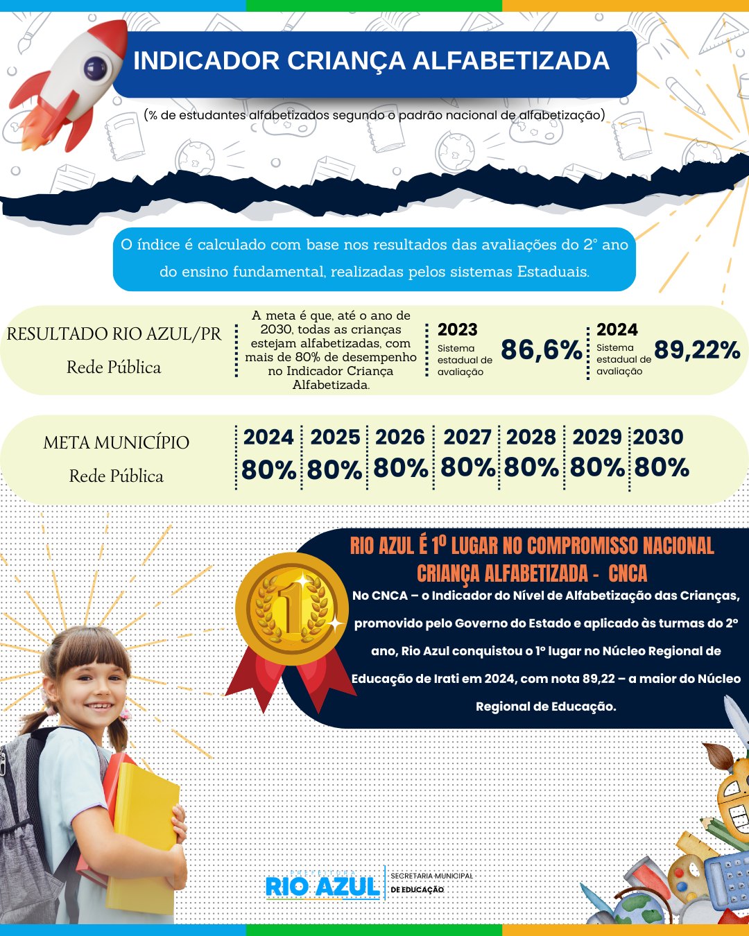 Rio Azul conquistou o primeiro lugar entre os municípios da região nos resultados da Avaliação da Alfabetização 2024, dentro do Compromisso Nacional da Criança Alfabetizada, divulgados pelo Ministério da Educação (MEC). O índice, que mede o percentual de crianças alfabetizadas ao final do 2º ano do Ensino Fundamental, foi calculado a partir das avaliações aplicadas pelos sistemas estaduais, como a Prova Paraná Mais, realizada em todo o estado.
