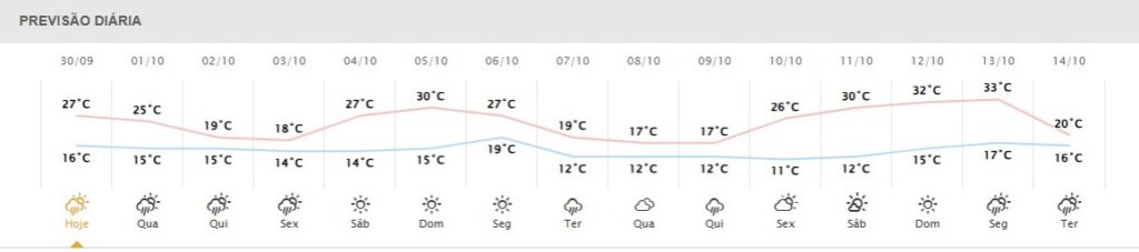 Irati-PR: de terça-feira (30) até sexta-feira (03/10) o tempo permanece parcialmente nublado, com alta probabilidade de chuva para todos os dias. A temperatura mínima para semana é de 14º C e máxima de 27º C. No sábado (04/10) e domingo (05/10), o tempo permanece estável e o céu aberto e claro. No fim de semana, as temperaturas variam de 14º C a 30º C.