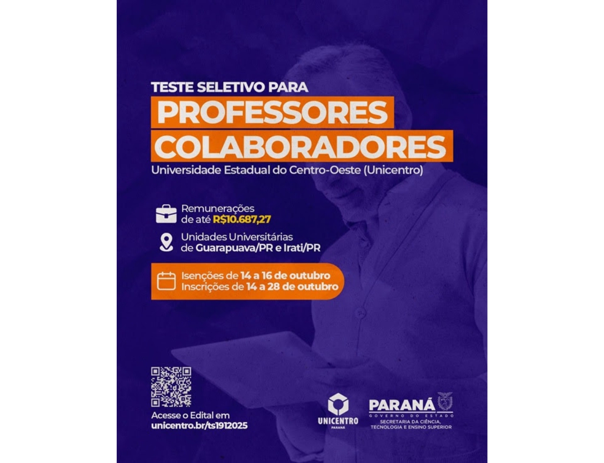 A Universidade Estadual do Centro-Oeste (Unicentro) está com inscrições abertas para um novo teste seletivo de professores colaboradores. As vagas abrangem as áreas de Saúde, Ciências Agrárias e Ambientais, Ciências Exatas, Humanas e Sociais Aplicadas, com oportunidades nos câmpus de Guarapuava e Irati.