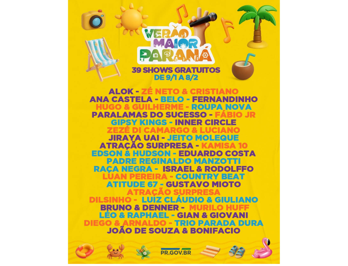 O Governo do Paraná anunciou nesta terça-feira (21) os nomes das atrações do Verão Maior Paraná 2026. São cinco finais de semana seguidos de espetáculos gratuitos, de 9 de janeiro a 8 de fevereiro. Entre as novidades estão shows nas quintas-feiras, atrações internacionais e palcos que devem ser maiores do que no ano passado. Os shows acontecerão nas praias de Matinhos e Pontal do Paraná e terão transmissão do SBT, Band, TVCI, Banda B e TV Paraná Turismo para todo o Brasil.